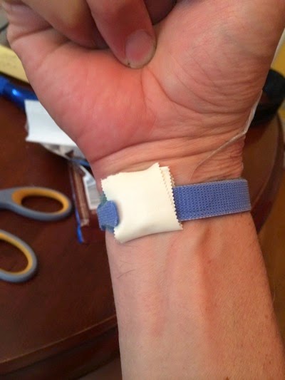 Which work great for a day or two, until elastic tape and skin traction made for a nasty burn-like dermatitis. Good thing I was experimenting on myself. So then I went on to make a soft fabric strap out of “Get-A-Grip” multi-use velcro straps …